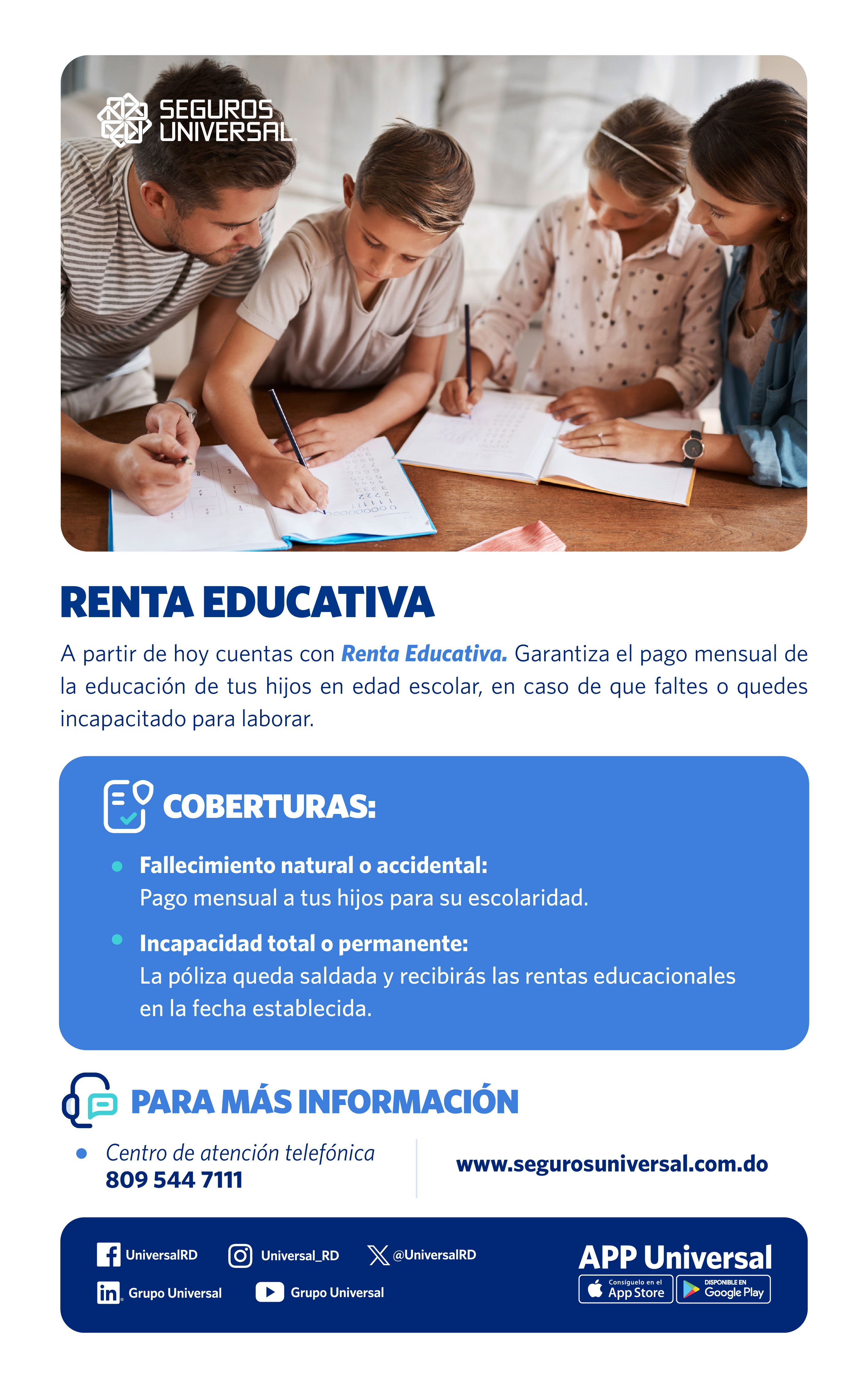Garantiza el pago de la educación de los hijos del asegurado en edad escolar y/o universitaria, en caso de que falte o se invalide de manera total y permanente.
