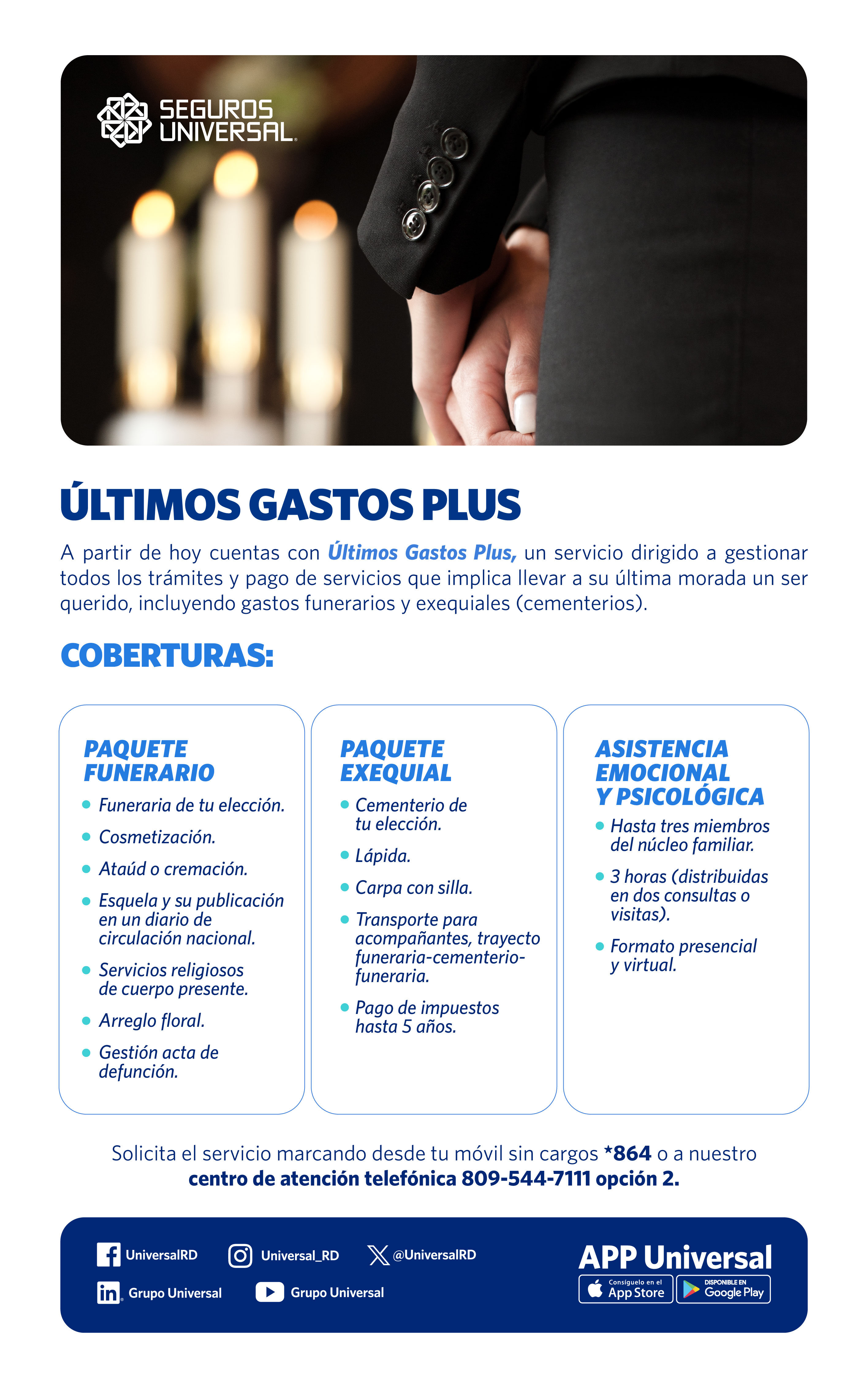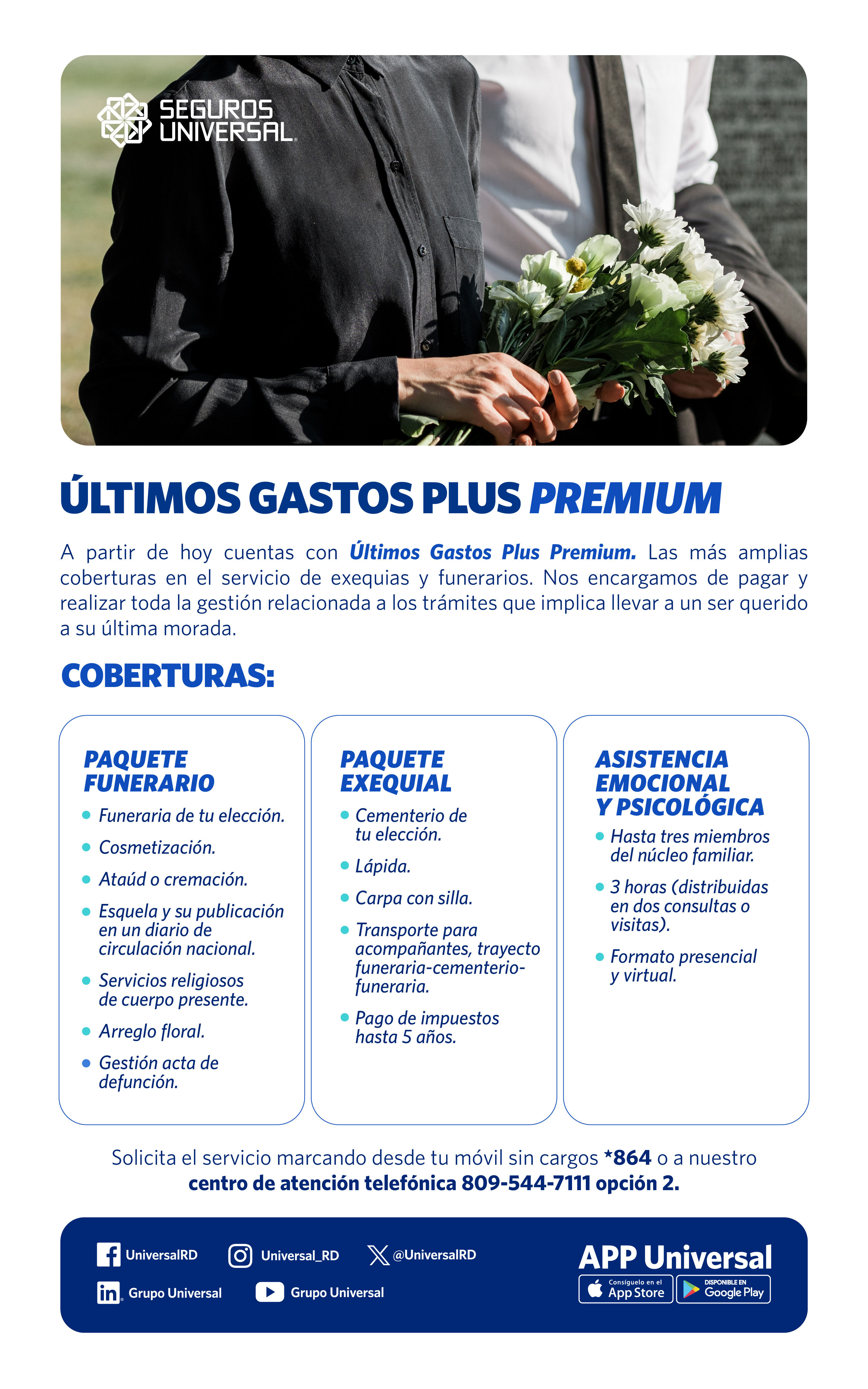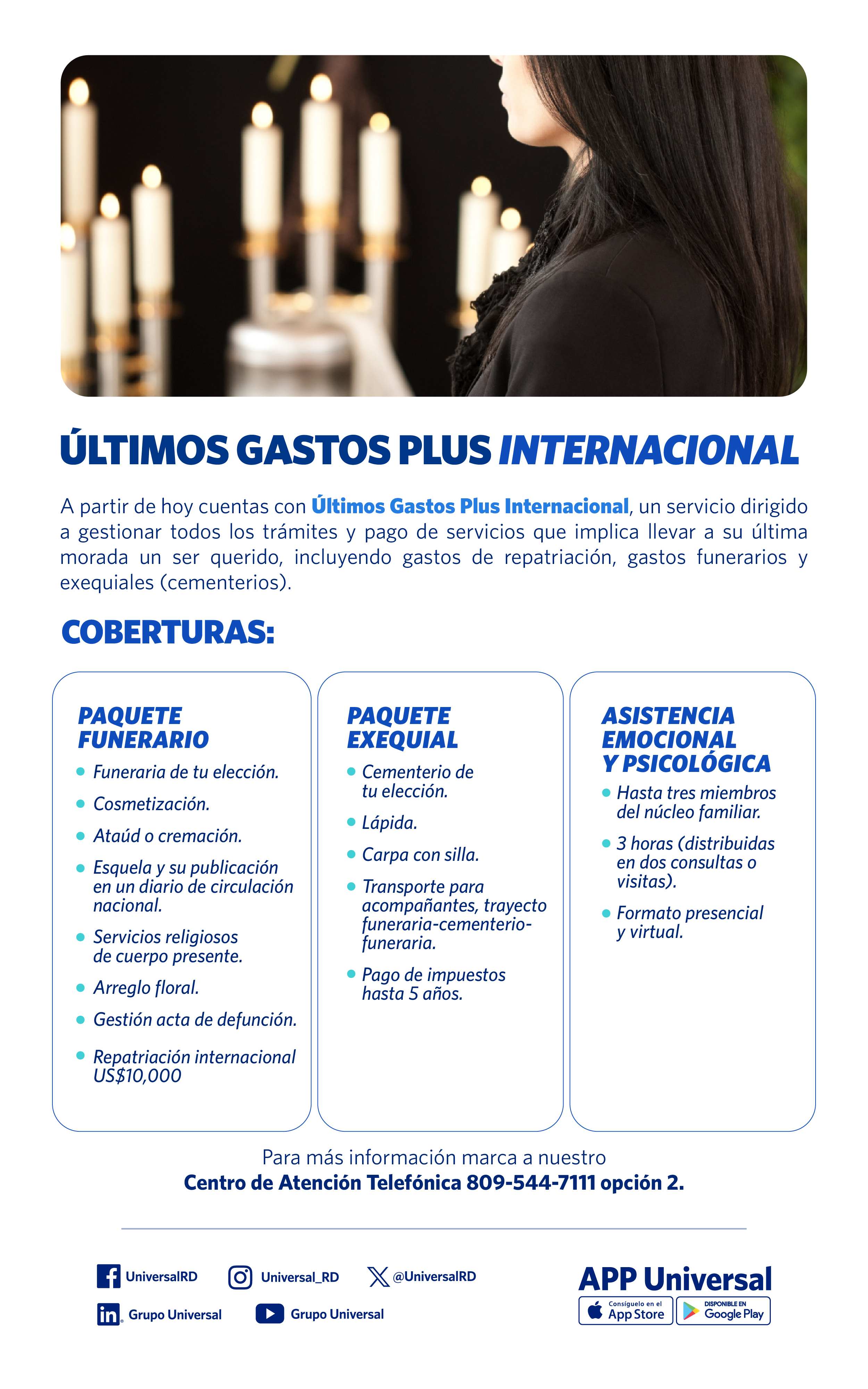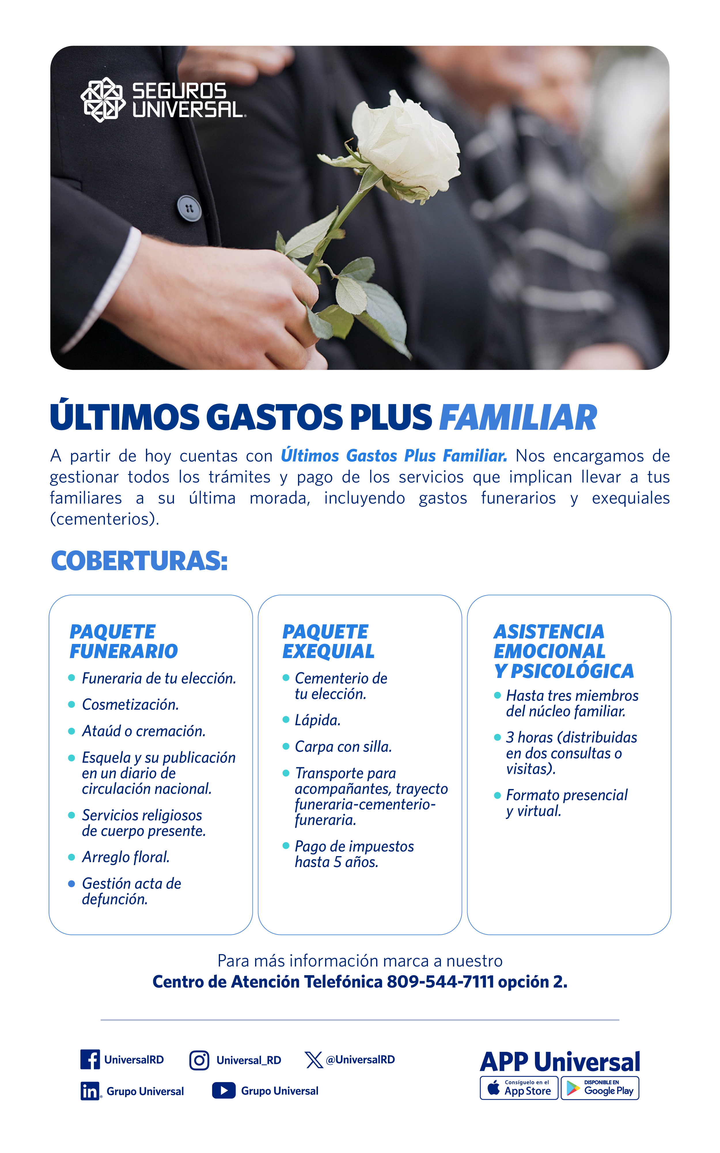 Servicio dirigido a gestionar todos los trámites y pagos que implican llevar a un ser querido a su última morada con cobertura hasta RD$50,000.